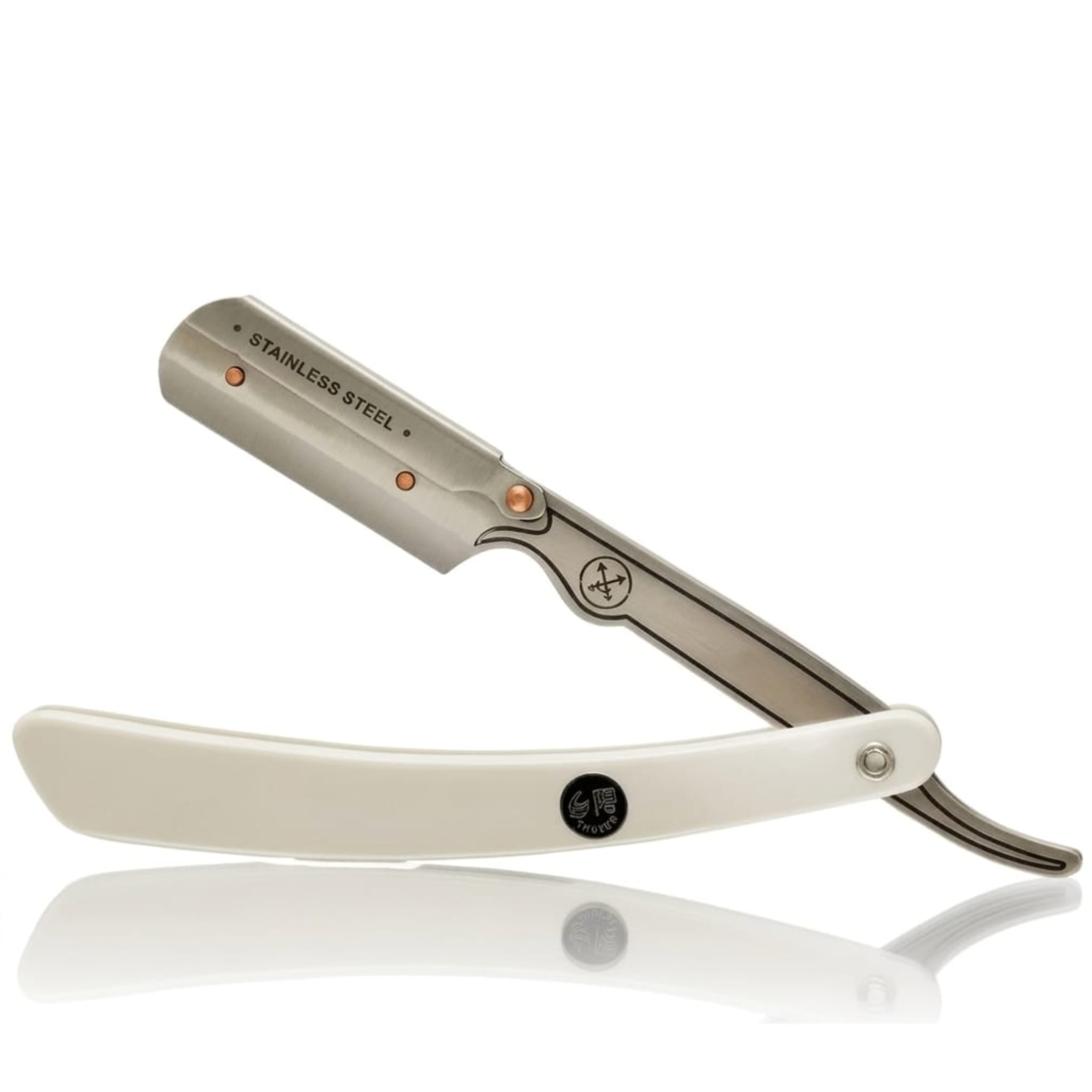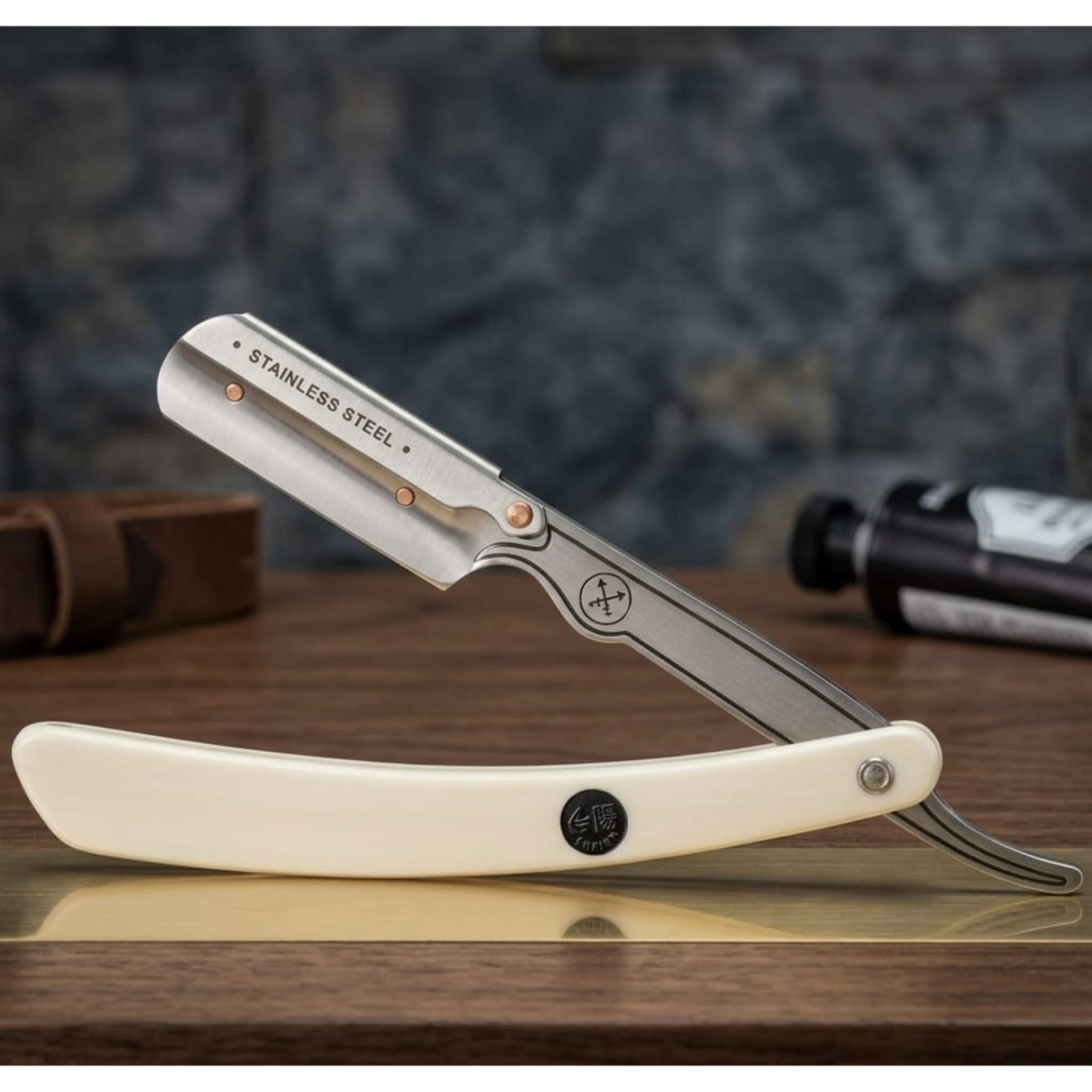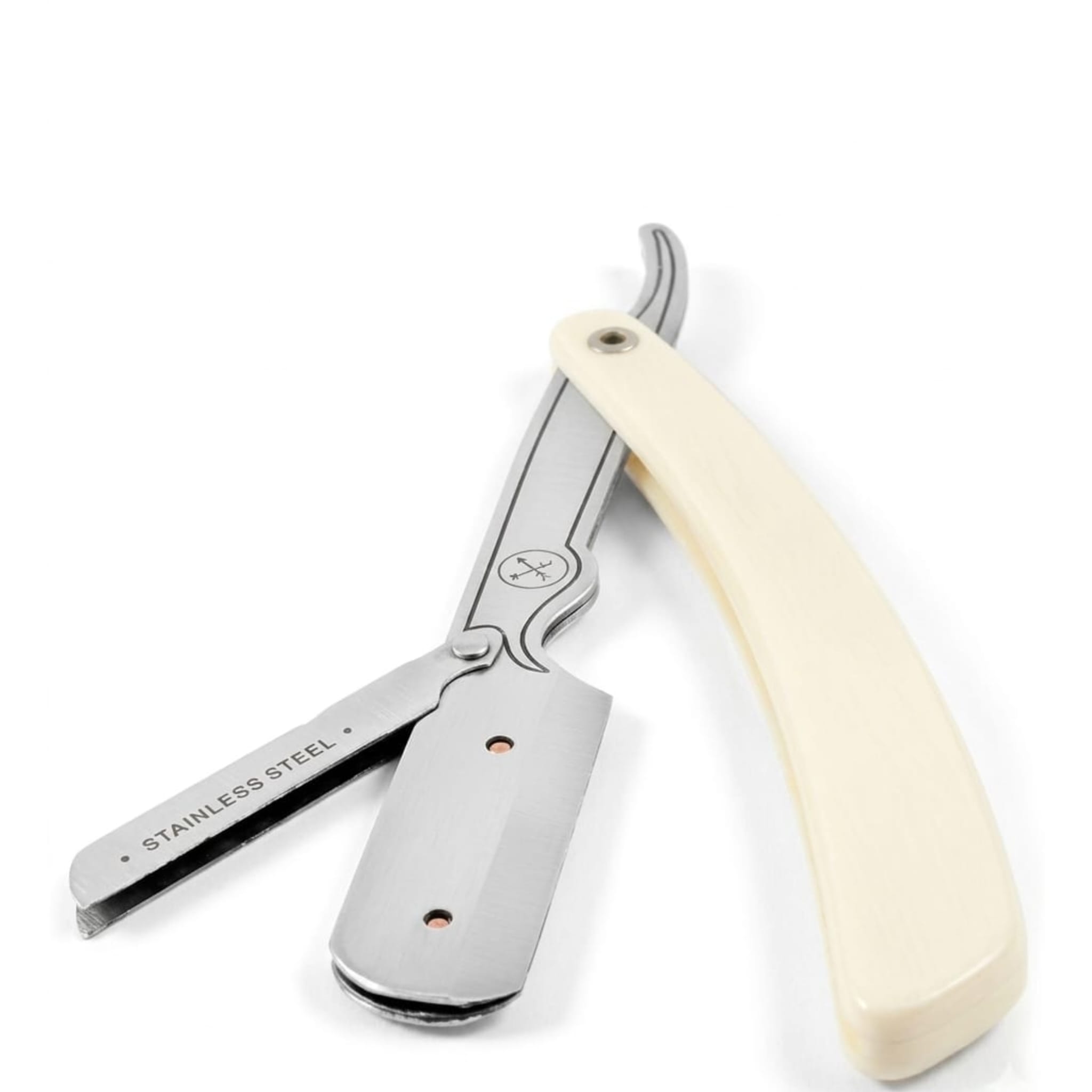 La particularidad de la Ref. SRW/34R reside en su mango de resina blanca. Este material no solo es estéticamente atractivo, recordando a las navajas de hueso de antaño, sino que es extremadamente duradero, resistente al agua y fácil de limpiar. El brazo de la hoja, fabricado en acero inoxidable de alta calidad, garantiza que la herramienta no se oxide ni pierda su brillo con el uso diario.
