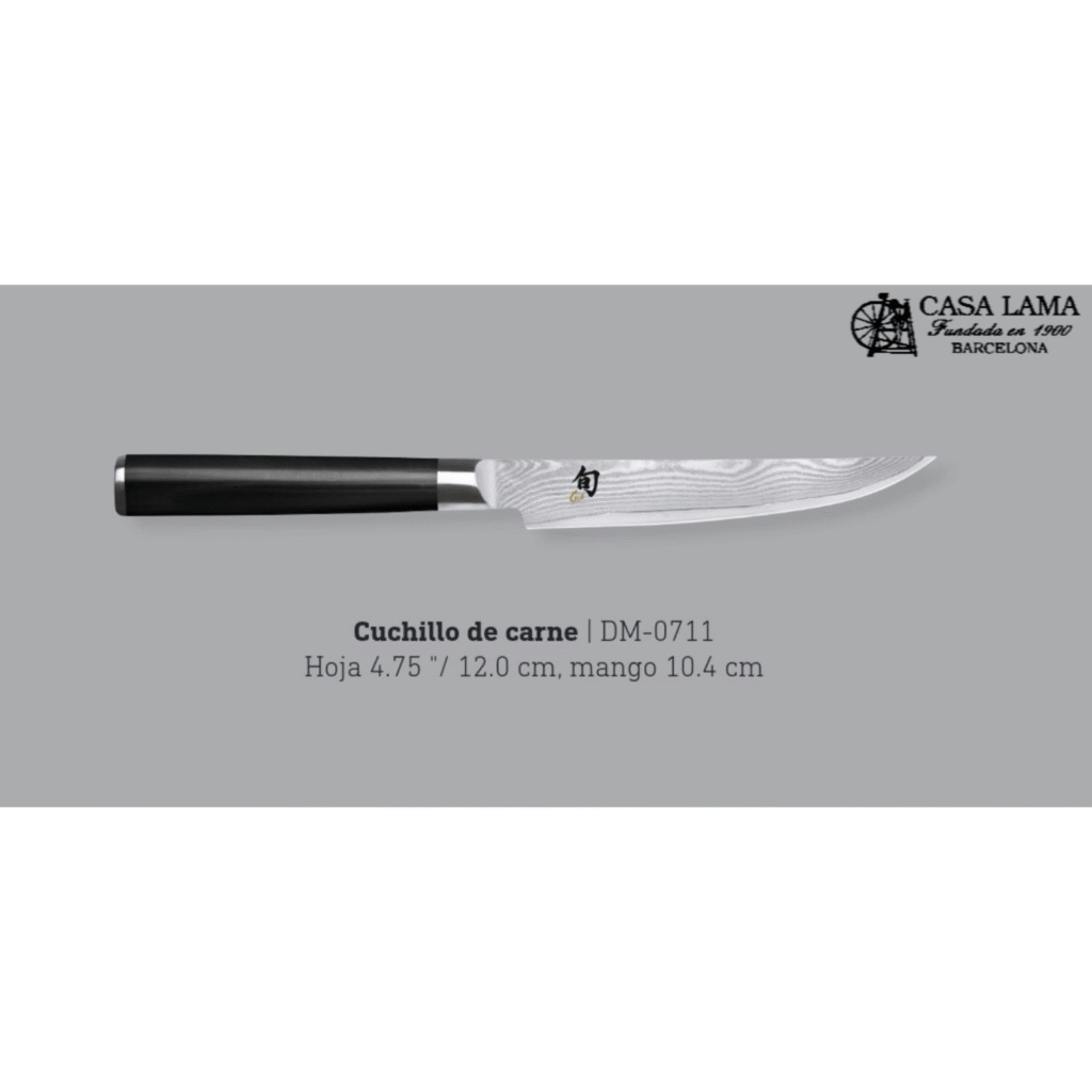 • De carne o steak: Hoja precisa, afilada, pensada para no desgarrar ni aplastar cortes cocinados. Si quieres probar dos opciones de primer nivel, recomendamos el elegante Wüsthof Classic Ikon Crème steak 12 cm —con su diseño clásico alemán y mango ergonómico marfil— y el refinado Kai Shun Damasco steak 12 cm, una joya japonesa de hoja damasquinada y filo impecable.